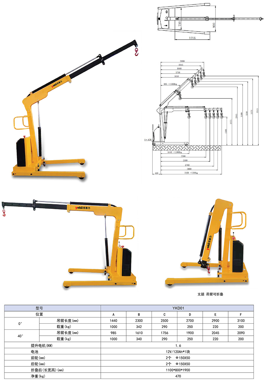 ● 手拉行走,電動起升,吊臂電動伸縮。