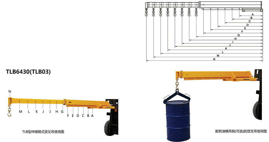● 可調伸縮超長吊臂, 適用于叉車不易進入的區域進行操作。