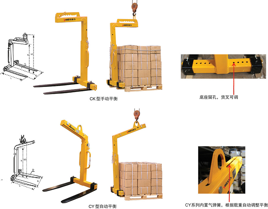 ● CK系列為手動平衡,根據貨物的重量不同,調整吊環所卡鋸齒位置。